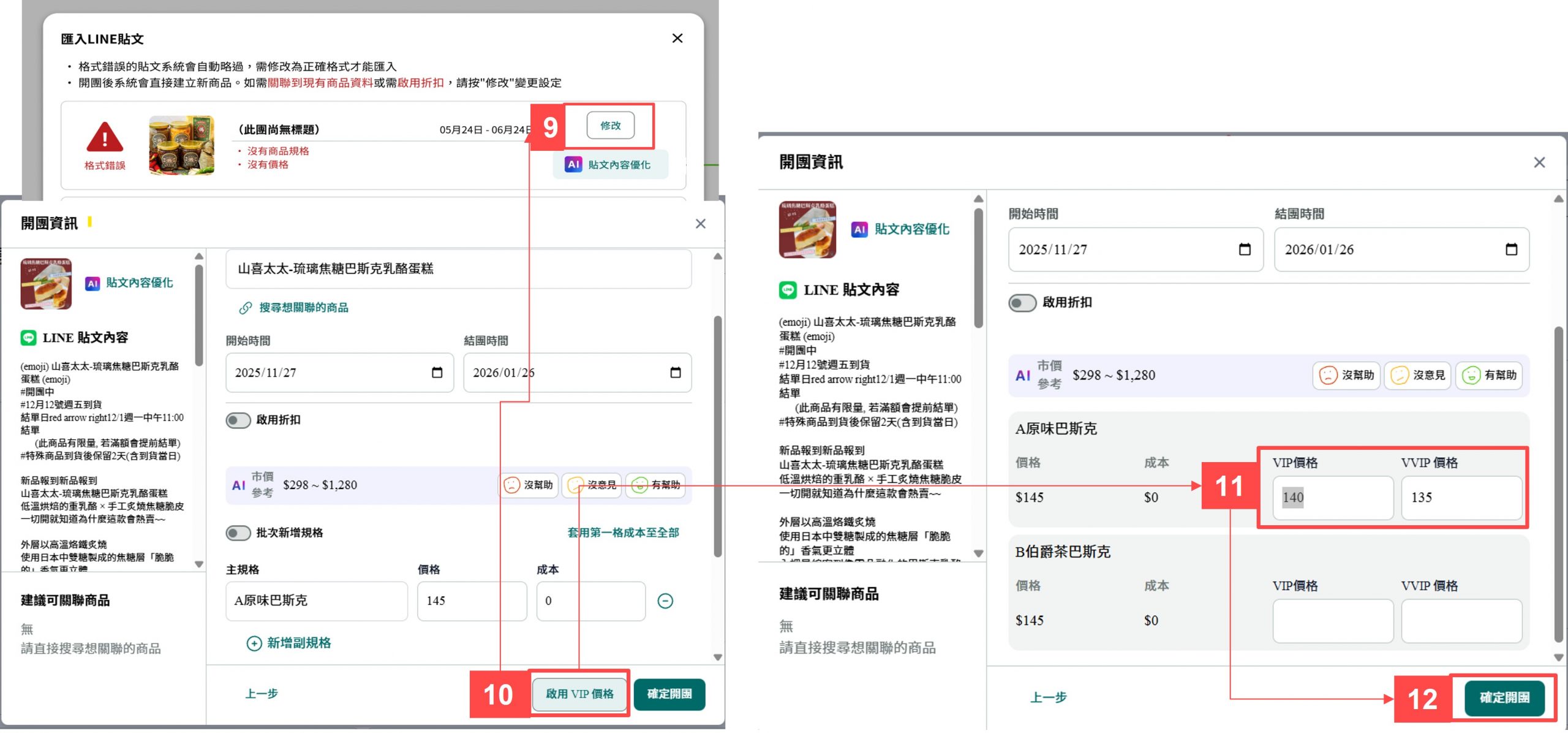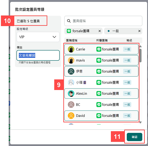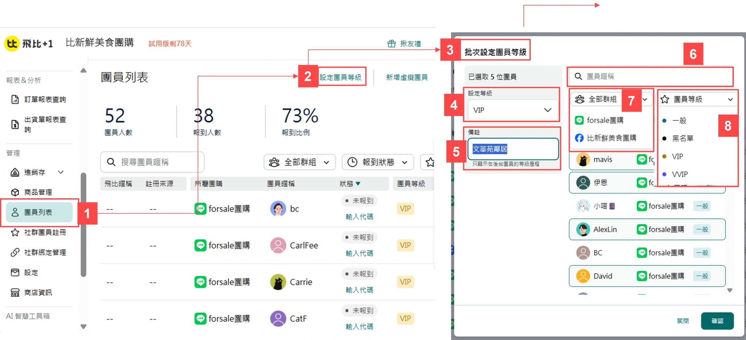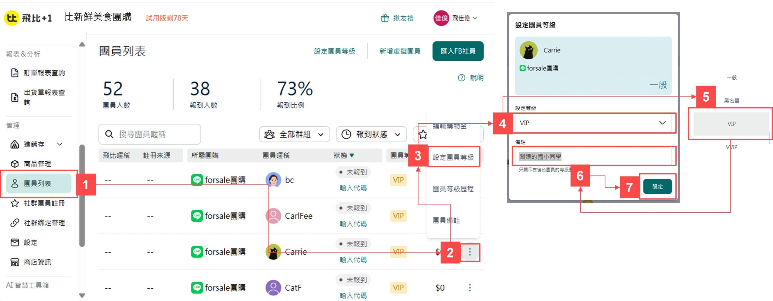 🆕 團員等級與變價設定 FLYe 2025 年 11 月 28 日2025 年 11 月 28 日 內容大綱 Toggle 如何(個別)設定團員等級如何(批次)設定團員等級如何查詢團員等級的操作歷程匯入新貼文的 VIP 價格設定團員如何自行查詢等級 助您快速搞定團員等級設定和 VIP 價格管理嗎?這篇教學一次帶你搞定所有步驟! 不管是特定團員設定、批次團員更新,還是查歷程、讓團員學會查詢自已的會員等級,都有清楚操作指南,接著教你學會如何在匯入新貼文時設定 VIP 價格,【新功能】幫助您在團員等及與變價管理的流程更順手。 如何(個別)設定團員等級 團主想快速個別設定團員等級嗎?跟著下面的流程一步一步來,超簡單!前往【 設定 > 團員列表 】至上方搜尋框輸入 搜尋團員暱稱 後,再點選右側的三個小垂直點『(︙)』項鈕選擇『 設定團員等級 』選項點擊『 設定等級 』可顯示下拉選單的選項你可以替團員設定為 『 一般 』、 『 黑名單 』、 『 VIP 』、 『 VVIP 』,共四種等級 想補充說明時,也可以在『備註』欄位輸入提醒文字最後按下『 設定 』鈕,就大功告成啦!🎉 如何(批次)設定團員等級 團主想要批次設定團員等級嗎?按照以下步驟操作,就能輕鬆搞定!前往【 設定 > 團員列表 】點擊上方【 設定團員等級 】即可開啟 【 批次設定團員等級 】的操作視窗點擊『 設定等級 』,選擇這批次要設定的團員等級若需要,也可輸入「備註」內容,例如:「文華苑鄰居」(⚠️只會顯示在賣家後台的團員等級歷程)到搜尋框輸入 團員暱稱 ,即可快速找到所調整的團員(⚠️找到後請點一下團員名字,才能成功選取)透過 『 團員來源 』篩選,可快速找到團員並點選篩選需設定的『 團員等級 』,(若未設定過,預設為「一般」),亦可批次設定團員為其它三種等級 『 黑名單 』、 『 VIP 』、 『 VVIP 』 若上面的篩選條件已設定完成了,就可以開始批次點選要調整團員等級的名單嘍~怎麼操作呢?9.點擊『團員暱稱』,即可成功選取名單10.顯示已被你選取的人數『 設定團員等級 』11.按下『 確定 』鈕,就大功告成啦!🎉 如何查詢團員等級的操作歷程 前往【 設定 > 團員列表 】點選右側的三個小垂直點『(︙)』,即可顯示功能選項選擇『 團員等級歷程 』選項即可查詢操作紀錄明細 匯入新貼文的 VIP 價格設定 前往【《 飛比+1 團購訂單系統 》賣家後台 > 訂單區 > 開團&訂單】點擊『 匯入貼文 』(右上角)選擇將要匯入的貼文來源點擊『 下一步 』 開啟『 只顯示有留言的貼文 』開關時,將只會顯示有留言的貼文 勾選『 ☑ 』匯入的貼文 顯示『 ☑ 』即表示該篇貼文有新留言確認後,點擊『 下一步 』 9. 於匯入開團貼文列表中,點擊『 修改 』鈕10. .點擊『 啟用 VIP 價格 』11. 可分別依 VIP 和 VVIP 價格輸入不同的價格12. 確認後,點擊『 確認開團 』 團員如何自行查詢等級 當團主完成團員等級設定後,團員無論是在 Web/APP 的「全部訂單、待付款、待收(取)貨」區塊頁面中,檢視自已的團員等級。⚠️ 若團員身分是「一般」或「黑名單」,就不會顯示喔! 加入飛比+1 LINE 官方帳號 如有任何操作問題或需開通帳號,請加入LINE客服,立即有專人為您服務😍❶ 透過網址👉 https://r.feebee.tw/ZE❷ 掃描右側 QR Code 加入